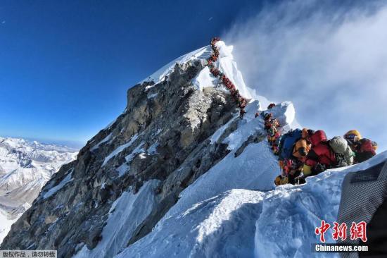 資料圖為數(shù)百名登山者在珠峰登頂之路上排隊(duì)。