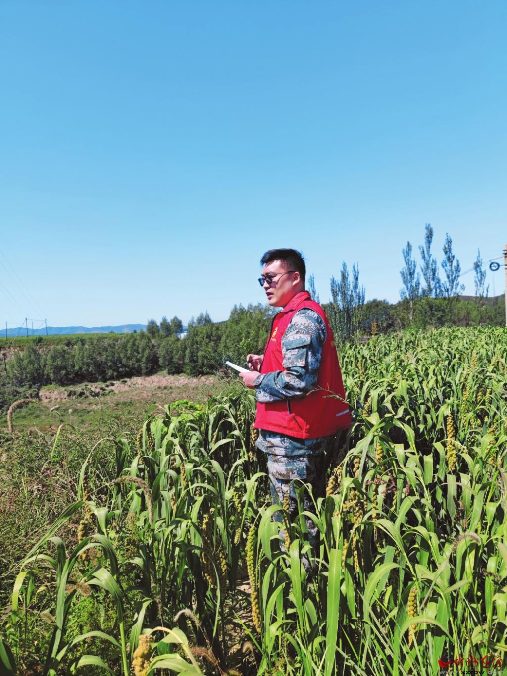 郭晉超在田間記錄莊稼長(zhǎng)勢(shì)情況