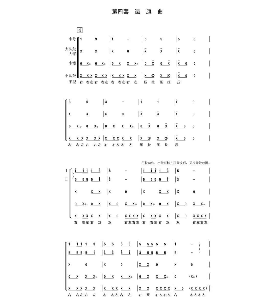 少先隊(duì)鼓號(hào)隊(duì)總譜除間奏鼓外共10套曲目,包括:開(kāi)場(chǎng)曲、進(jìn)行曲、出旗曲、退旗曲、頒獎(jiǎng)曲、授巾曲、檢閱曲、宣誓曲、迎賓曲、歡送曲。