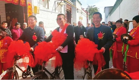 婚禮當(dāng)天,杜家寨社區(qū)兩委班子陪著新郎官一起,騎上老式帶大梁的自行車。新郎官身上披紅掛彩喜氣洋洋,車上挽著大紅花,在鄉(xiāng)親們的簇?fù)砗屯L(fēng)鑼鼓隊的陣陣鼓樂聲中,騎行來到新娘子的家中,把美麗的新娘子抱在自行車后座的紅墊子上,熱熱鬧鬧地娶回了家。