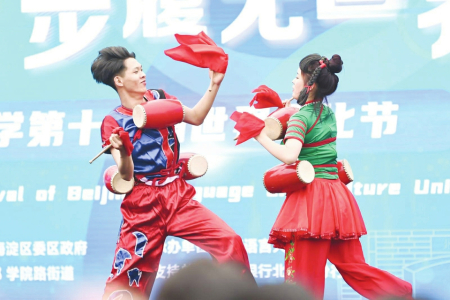 當日活動吸引了來自世界各地的3萬余名師生及社會各界人士。獨唱《人說山西好風(fēng)光》《千年一塔》,舞蹈《醋之韻》《翼城花鼓》等贏得師生們熱烈掌聲。在五大洲文化展區(qū),絳州木版年畫傳承人吳百鎖現(xiàn)場印制木版年畫贈送師生,成為一道亮麗風(fēng)景。廣靈剪紙、應(yīng)縣木塔模型、黎侯虎、寧武毛健茶等吸引各國留學(xué)生駐足欣賞?!叭A夏古文明山西好風(fēng)光”主題相框前,無數(shù)外國友人饒有興趣交流互動,拍照留念?!吧轿髟亍被鸨本┱Z言大學(xué)世界文化節(jié)。