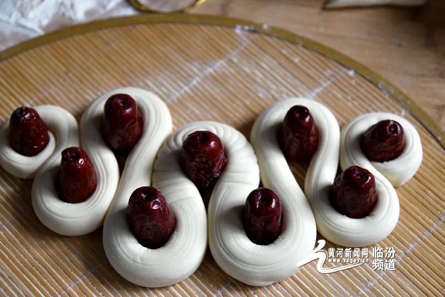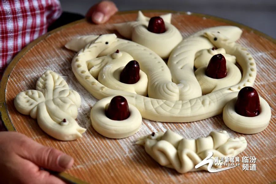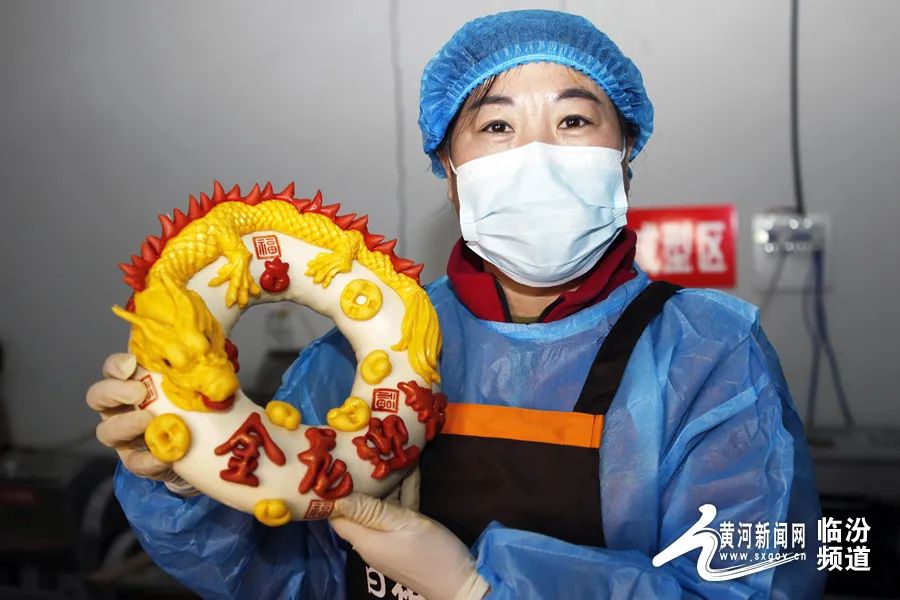 在晉南,蒸花饃是不可缺少的一項(xiàng)年俗?;x藝人用面粉、果蔬汁、雞蛋和牛奶等食材為原料,巧手捏制出“金龍迎春”“迎春納福”等寓意吉祥的系列花饃,為即將到來的龍年春節(jié)增添了濃濃的年味。
