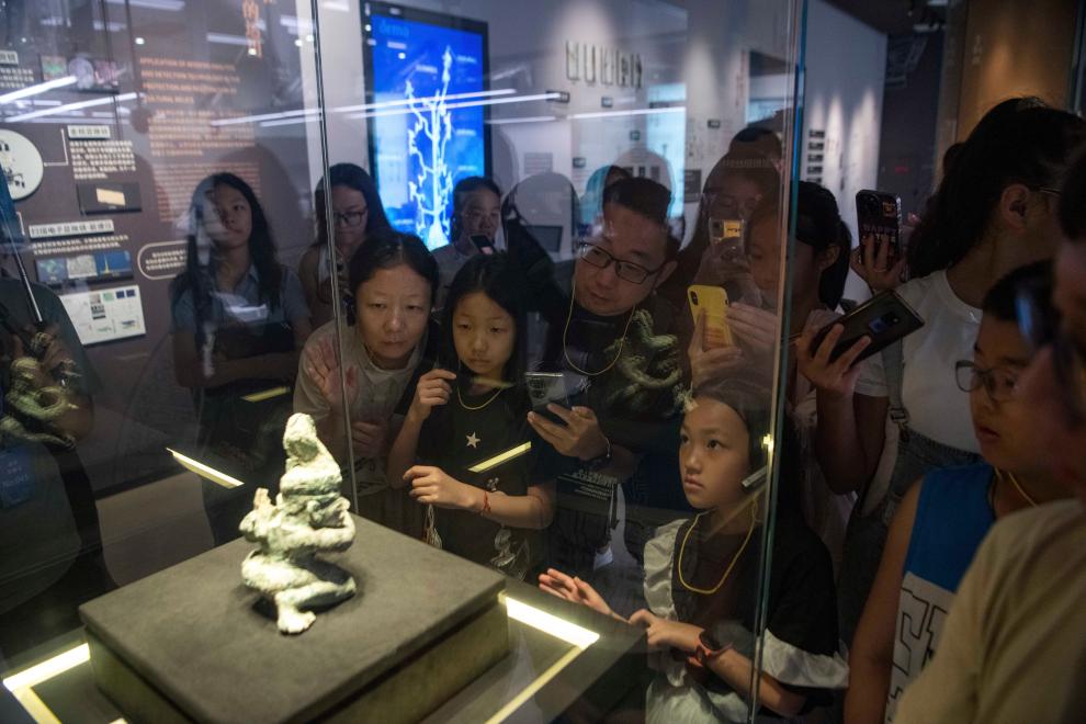 在四川廣漢三星堆博物館文物保護(hù)與修復(fù)館,游客在“匠心妙手——三星堆遺址新出土文物保護(hù)修復(fù)成果展示”試開(kāi)放期參觀(7月22日攝)。新華社記者 唐文豪 攝