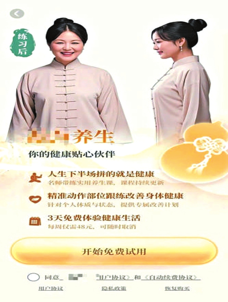 還有些App則更加離譜,下載完成后,點(diǎn)進(jìn)去的第一步就是要購(gòu)買會(huì)員,之后才能正常使用。但在購(gòu)買流程上,平臺(tái)卻耍起了花招。比如一款提供“養(yǎng)生指導(dǎo)服務(wù)”的App,頁(yè)面上會(huì)有一個(gè)大大的按鈕,寫著“開始免費(fèi)試用”。但在按鈕的旁邊,卻有一行非常不起眼的小字:“每周僅需48元,可隨時(shí)取消?!倍坏┯脩酎c(diǎn)擊開始試用,系統(tǒng)就會(huì)跳轉(zhuǎn)到自動(dòng)續(xù)費(fèi)的開通界面。如果是辨別能力差的老人,可能還以為是在填寫什么注冊(cè)信息。