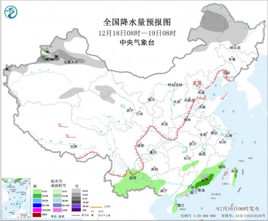 12月18日08時(shí)至19日08時(shí),內(nèi)蒙古東北部、黑龍江中北部、新疆北部和南疆西部山區(qū)、甘肅河西等地部分地區(qū)有小到中雪或雨夾雪,其中,新疆沿天山地區(qū)和伊犁河谷局地有大到暴雪(10~16毫米)。湖南南部、福建東部和南部、西南地區(qū)南部、廣西西南部、廣東東部和南部、海南島東部、臺(tái)灣島東部等地部分地區(qū)有小到中雨,其中,廣東東部局地有大雨(25~35毫米)。遼寧東部、西藏中北部等地部分地區(qū)有4~6級風(fēng);臺(tái)灣海峽、巴士海峽、南海東北部和中東部海域?qū)⒂?~7級大風(fēng)、陣風(fēng)8級。
