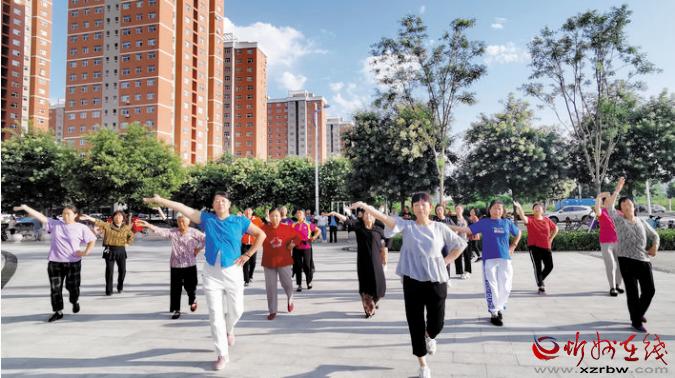 8月10日早上,民心家園小區(qū)居民在比鄰的遺山公園內(nèi)跳舞、走旗袍秀,展示精神風貌,享受幸福生活。 曹建華 攝