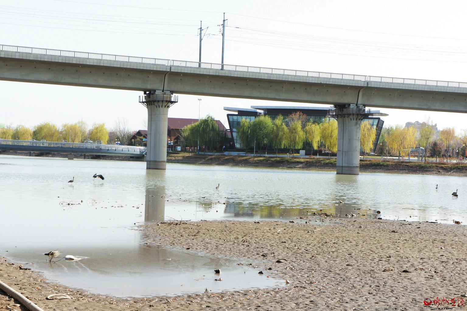 11月7日,數(shù)只黑鸛在云中河景區(qū)高速鐵路橋下涉水覓食。我市在加大城市基礎(chǔ)設(shè)施建設(shè)的同時(shí),公園和綠地的建設(shè)同步提速,極大地改善了人居環(huán)境。優(yōu)美的環(huán)境不僅提高了居民的生活質(zhì)量,也吸引了野生鳥類棲息。 (張劍雄 攝)