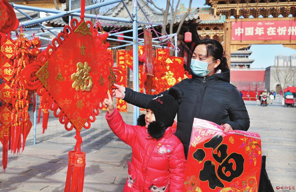春節(jié)臨近,我市各大商場(chǎng)和年貨市場(chǎng)洋溢著濃濃的年味兒。春聯(lián)、“?!弊?、“中國(guó)結(jié)”等賀歲商品琳瑯滿目,到處都是紅紅火火的過(guò)年氣氛。右圖為2月3日,市民在忻州古城南北大街集市上選購(gòu)年貨。 (張存良 攝)
