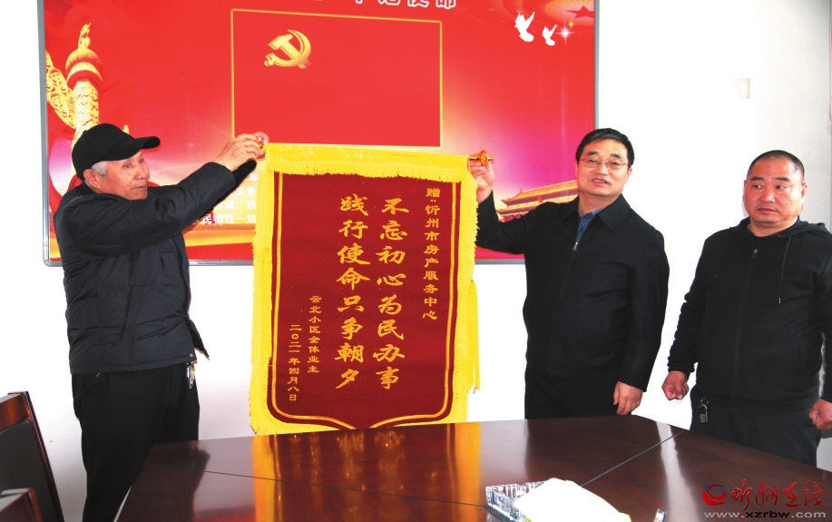 本報(bào)訊 4月14日上午,市房產(chǎn)服務(wù)中心三樓會(huì)議室內(nèi),云北小區(qū)居民和物業(yè)公司員工十幾個(gè)人,滿懷著感激之情,手捧著寫有“不忘初心為民辦事、踐行使命只爭(zhēng)朝夕”的一面錦旗,送給了市房產(chǎn)服務(wù)中心,落款為:云北小區(qū)全體居民。