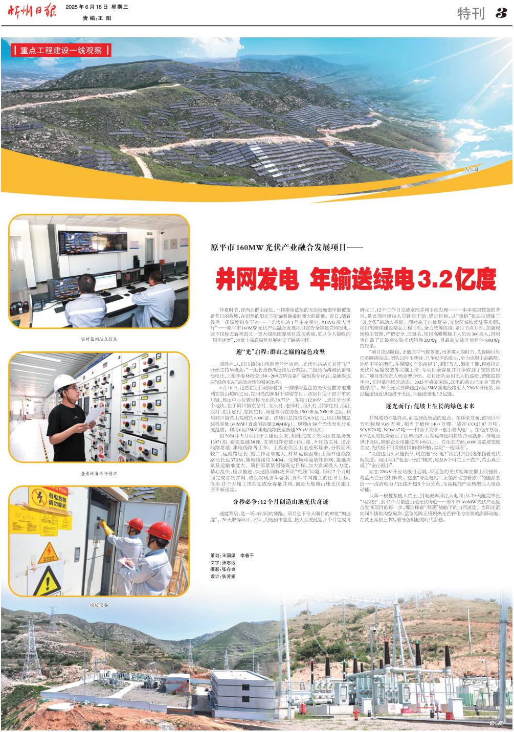 “項(xiàng)目攻堅(jiān)階段,正值原平氣候多變,雨多霧大的時(shí)節(jié),為保障目標(biāo)任務(wù)圓滿完成,團(tuán)隊(duì)以時(shí)不我待、只爭(zhēng)朝夕的勁頭,全力克服山高路險(xiǎn)、地勢(shì)不平的困難,在保障安全的前提下,緊盯節(jié)點(diǎn),倒排工期,積極推進(jìn)光伏片運(yùn)輸安裝等關(guān)鍵工作,為項(xiàng)目全容量并網(wǎng)爭(zhēng)取到了寶貴的時(shí)間?!表?xiàng)目部負(fù)責(zé)人楊亞賽介紹。項(xiàng)目團(tuán)隊(duì)運(yùn)用無人機(jī)巡檢、智能監(jiān)控平臺(tái),實(shí)時(shí)掌控場(chǎng)區(qū)動(dòng)態(tài)。2025年盛夏來臨,這里的荒山已變身“藍(lán)色能源?!薄?8個(gè)光伏方陣通過6回35kV集電線路匯入220kV升壓站,再經(jīng)輸送線直供經(jīng)濟(jì)開發(fā)區(qū),年輸送綠電3.2億度。