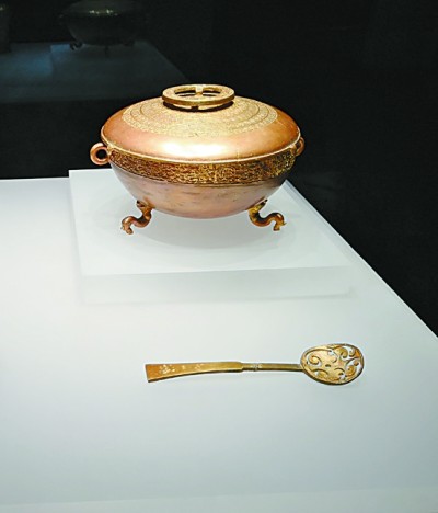 湖北曾侯乙墓出土的金盞和金漏匕(食器)本報記者 李韻攝/光明圖片