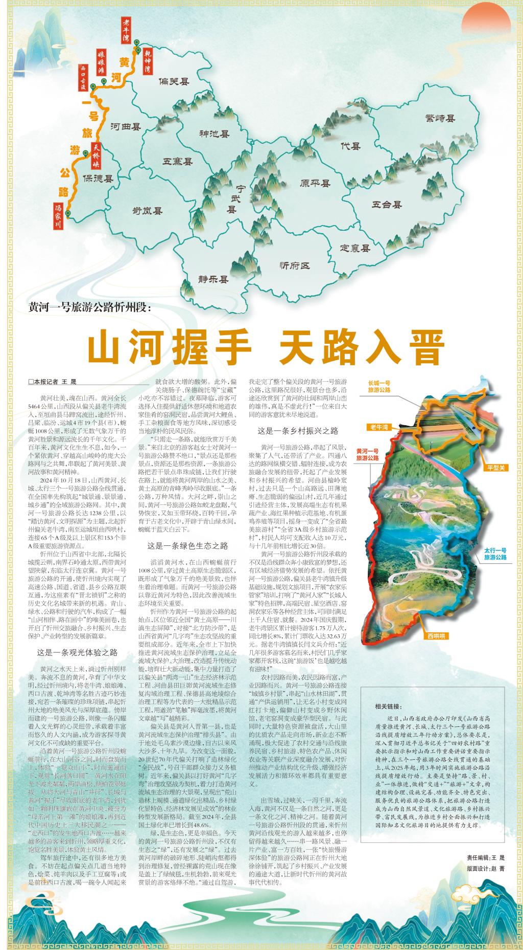 黃河壯美,魂在山西。黃河全長5464公里,山西段從偏關(guān)縣老牛灣流入,至垣曲縣馬蹄窩流出,途經(jīng)忻州、呂梁、臨汾、運城4市19個縣(市),蜿蜒1008公里,形成了無數(shù)氣象萬千的黃河勝景和源遠(yuǎn)流長的千年文化。千百年來,黃河文化生生不息,如今,一個緊依黃河、穿越高山峻嶺的龐大公路網(wǎng)與之共舞,串聯(lián)起了黃河美景、黃河故事和黃河精神。 2024年10月18日,山西黃河、長城、太行三個一號旅游公路全線貫通,在全國率先構(gòu)筑起“城景通、景景通、城鄉(xiāng)通”的全域旅游公路網(wǎng)。其中,黃河一號旅游公路長達(dá)1238公里,以“踏訪黃河、文明探源”為主題,北起忻州偏關(guān)老牛灣,南至運城垣曲西哄村,連接65個A級及以上景區(qū)和153個非A級重要旅游資源點。 忻州位于山西省中北部,北隔長城攬云朔,南界石嶺通太原,西帶黃河望陜蒙,東臨太行連京冀。黃河一號旅游公路的開通,使忻州境內(nèi)實現(xiàn)了高速公路、國道、省道、縣鄉(xiāng)公路互聯(lián)互通,為這座素有“晉北鎖鑰”之稱的歷史文化名城帶來新的機(jī)遇。青山、綠水、公路和行駛的汽車,構(gòu)成了一幅“山河相伴、路在畫中”的唯美畫卷,也開啟了忻州交旅融合、鄉(xiāng)村振興、生態(tài)保護(hù)、產(chǎn)業(yè)轉(zhuǎn)型的發(fā)展新篇章。 這是一條觀光體驗之路 黃河之水天上來,淌過忻州別樣美。奔流不息的黃河,孕育了中華文明,經(jīng)過忻州境內(nèi),將老牛灣、娘娘灘、西口古渡、乾坤灣等名勝古跡巧妙連接,宛若一條璀璨的珍珠項鏈,串起忻州大地的絕美風(fēng)光與深厚底蘊。傍岸而建的一號旅游公路,則像一條閃耀著人文光輝的心靈紐帶,承載著豐富而悠久的人文內(nèi)涵,成為游客探尋黃河文化不可或缺的重要平臺。 沿著黃河一號旅游公路忻州段蜿蜒前行,在大山河谷之間,時而盤旋而上,體驗“一覽眾山小”,時而迤邐而下,觀賞“長河落日圓”。黃河水在陽光下波光粼粼,兩岸油松、側(cè)柏蒼翠挺拔。從將大河與青山“并行”、長城與黃河“握手”盡收眼底的老牛灣,到猶如一顆明珠鑲嵌在黃河中央、被譽(yù)為“母親河上第一灘”的娘娘灘,再到近代中國歷史上三大移民潮之一——“走西口”的發(fā)生地西口古渡……越來越多的游客來到忻州,領(lǐng)略厚重文化,飽覽名勝美景,體驗黃土風(fēng)情。 駕車旅行途中,還有很多地方美食。不妨在起點偏關(guān)點幾道當(dāng)?shù)靥厣?,燴菜、燉羊肉以及手工豆腐等;或是前往西口古渡,喝一碗令人聞起來就食欲大增的酸粥。此外,偏關(guān)燒腸子、保德碗饦等“寶藏”小吃亦不容錯過。夜幕降臨,游客可選擇入住提供舒適休憩環(huán)境和地道農(nóng)家佳肴的窯洞民宿,品嘗黃河大鯉魚、手工雜糧面食等地方風(fēng)味,深切感受當(dāng)?shù)卮緲愕拿耧L(fēng)民俗。 “只需走一條路,就能欣賞萬千美景?!眮碜员本┑挠慰挖w女士對黃河一號旅游公路贊不絕口,“景點還是那些景點,資源還是那些資源,一條旅游公路把若干景點串珠成鏈,讓我們行駛在路上,就能將黃河兩岸的山水之美、黃土高原的青峰秀嶺盡收眼底?!币粭l公路,萬種風(fēng)情。大河之畔,崇山之間,黃河一號旅游公路如蛟龍盤踞,氣勢恢宏,又如玉帶環(huán)繞,百轉(zhuǎn)千回,孕育于古老文化中,開辟于青山綠水間,蜿蜒于藍(lán)天白云下。 這是一條綠色生態(tài)之路 滔滔黃河水,在山西蜿蜒前行1008公里,穿過黃土高原生態(tài)脆弱區(qū),既形成了氣象萬千的絕美景致,也伴生著治理難題。而黃河一號旅游公路以靠近黃河為特色,因此改善流域生態(tài)環(huán)境至關(guān)重要。 忻州作為黃河一號旅游公路的起始點,區(qū)位鄰近全國“黃土高原——川滇生態(tài)屏障”,對接“北方防沙帶”,是山西省黃河“幾字彎”生態(tài)攻堅戰(zhàn)的重要組成部分。近年來,全市上下加快推進(jìn)黃河流域生態(tài)保護(hù)治理,立足全流域大保護(hù)、大治理,改造提升傳統(tǒng)動能,培育壯大新動能,集中力量打造了以偏關(guān)縣“兩灣一山”生態(tài)經(jīng)濟(jì)林示范工程、河曲縣田巨峁黃河流域生態(tài)修復(fù)溝域治理工程、保德縣高地堎綜合治理工程等為代表的一大批精品示范工程,用遒勁“筆觸”揮毫潑墨,將黃河文章越“寫”越精彩。 偏關(guān)縣是黃河入晉第一縣,也是黃河流域生態(tài)保護(hù)治理“排頭縣”。由于地處毛烏素沙漠邊緣,自古以來風(fēng)大沙多、十年九旱。為改變這一面貌,20世紀(jì)70年代偏關(guān)打響了造林綠化“全民戰(zhàn)”,號召干部群眾接力義務(wù)植樹。近年來,偏關(guān)縣以打好黃河“幾字彎”治理攻堅戰(zhàn)為契機(jī),著力打造黃河流域生態(tài)治理的大景觀,呈現(xiàn)出“荒山造林上規(guī)模、通道綠化出精品、鄉(xiāng)村綠化顯特色、經(jīng)濟(jì)林發(fā)展見成效”的林業(yè)轉(zhuǎn)型發(fā)展新格局。截至2024年,全縣國土綠化率已增長到48.6%。 綠,是生態(tài)色,更是幸福色。今天的黃河一號旅游公路忻州段,不僅有生態(tài)之“綠”,還有發(fā)展之“綠”。過去黃河岸畔的破碎地形、陡峭溝壑都得到治理修復(fù),曾經(jīng)裸露的荒山現(xiàn)在像是蓋上了綠絨毯,生機(jī)勃勃,前來觀光賞景的游客絡(luò)繹不絕?!巴ㄟ^自駕游,我走完了整個偏關(guān)段的黃河