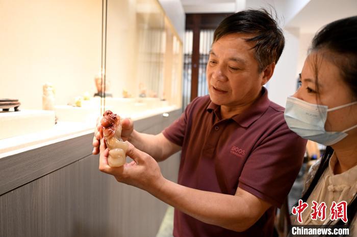 5月8日,在中國工藝美術大師、壽山石雕大師陳益晶位于福建省福州市壽山石鑒定中心的工作室里,年逾七旬的陳益晶向游客介紹壽山石雕作品。中新網(wǎng)記者 呂明 攝