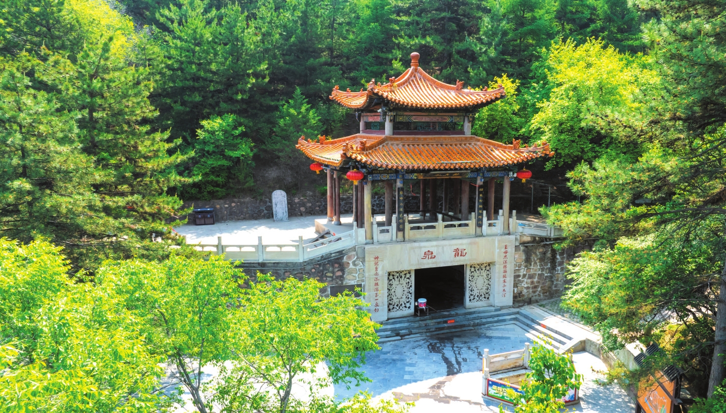 山有水而媚,土得水而沃。從大雄寶殿出來(lái),沿著西門旁一條小道不遠(yuǎn)處,就是那片號(hào)稱“天柱松濤”的松林了。只見樹干筆直,枝條蒼勁,直指云霄,林間松脂飄香,氣息悠然。人還在松林中流連尋芳,遠(yuǎn)遠(yuǎn)就能聽到聞名已久的“天柱龍泉”在流淌。龍泉位于景區(qū)廟群西南的龍泉閣,作為“靜樂舊八景”之首的“天柱龍泉”,又名“犬舐泉”,《魏書》載:“爾朱榮高祖羽健居北秀容川。會(huì)有狗舐地,因而穿之,得甘泉,故名?!毕鄠魅谐錾颀?,故名龍泉。高山出泉是為奇觀,泉水清澈見底,旱不涸、澇不盈,夏飲清神,冬飲沁心。有“天柱圣境啟心智,龍泉奇觀令神怡”之頌。此泉水富含多種礦物質(zhì)和微量元素,是地地道道的“天然級(jí)礦泉水”。近幾年上山鍛煉的居民很多,人們上山時(shí)自帶裝水工具,攜泉水以做飯和飲用,期盼著龍泉水能給人帶來(lái)健康和好運(yùn)。站在龍泉邊,總能感受到一陣陣濕潤(rùn)的水氣撲面而來(lái),甚至像風(fēng)一樣輕繞著周身,使人置身于自然美景中不愿離開,連呼吸也變得無(wú)比暢快起來(lái)。