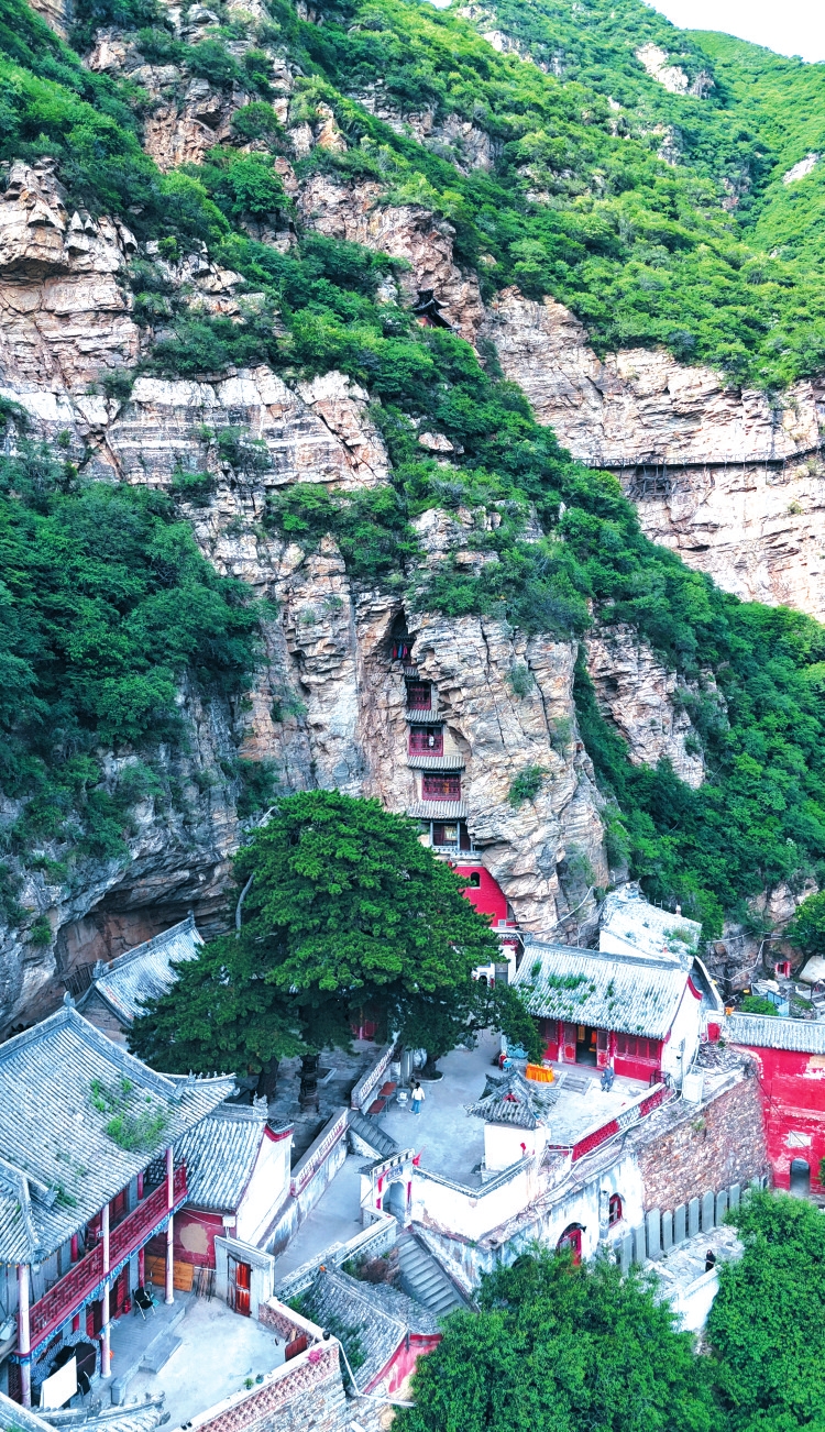 趙杲觀吳杰強攝 二 山石緘默,卻深藏千年傳說。藥王洞北山頂,一巨石形如巨龜偃臥,人稱“鎮(zhèn)山仙石”。相傳天臺寺初建,妖祟作亂,玉帝敕令東海龍王遣神龜至此鎮(zhèn)壓。藥王洞西側峭壁,天然呈現(xiàn)八卦卦爻,是為“八卦攢頂石”。傳說趙杲見弟子悟道艱難,遂運無上法力,凌空揮掌,將伏羲八卦圖烙印石壁,為迷途者點亮心燈。九仙女洞北側,一石突兀擎天,頂平如砥,可容數人趺坐,此乃“觀星臺”。相傳趙杲隱修老祖洞時,白日洞中苦讀黃卷,夜晚必登此臺,仰觀星漢流轉,參悟天地玄機,風雨霜雪無阻。年深日久,磐石竟被趙杲身體磨平,足見其超乎常人的毅力與恒心。 自朝元洞南行,便入南洞區(qū)。觀音洞(三圣殿)背嵌石洞,前出飛檐,中塑觀音、文殊、普賢三菩薩金身,周列十八羅漢,或執(zhí)卷,或捻珠,或秉缽,或弈棋,神態(tài)栩栩。兩壁所嵌瑯玕壁畫“觀音救難圖”尤為珍貴。自在庵洞乃僧侶清修禪房,前廊僅容旋馬,仰則危崖壓頂,俯見幽谷生云。洞分兩室,曲階相連,內室僅一小窗透入天光,炕灶猶存,歷來為高僧悟道坐化之圣所。 觀音洞東,是羅漢洞三層樓閣,懸匾“天庭”,配聯(lián)“深山藏古剎,綠樹隱圣地”。上百級石階如梯陡立,洞內敞朗,亦塑十八羅漢。相傳觀音于此現(xiàn)真身時,十八羅漢正在蟠桃園宴飲,循跡而至,見此青山綠水,頓覺是弘法佳境,遂感念菩薩點化,長聚此間,廣宣妙法。羅漢洞南,滴水洞蝸嵌崖底,池大如蓋,不涸不溢,清泉自壁隙如珠玉滴瀝。相傳建觀之初,觀中滴水貴如油。李姓和尚下山至鳳凰泉挑水,無論寒暑,每日往返十數里,肩肉磨爛而志不移。他惜水如命,自身渴極亦不飲半口。精誠所至,感動天臺山神,聚四方巖露滴瀝成此“滴水洞”。李仙廟玲瓏如龕,筑于觀音洞南側,內塑擔水李仙臥像:一手托桶梁,一手枕腦后,雙目微瞑,似笑非笑,猶在夢中擔水不輟。相傳李仙坐化時年僅36歲,手捧水瓢而逝,其挑水榆木扁擔竟插地生根成樹。傳說此樹因感應李仙生前醫(yī)道,剝其皮研末沖服,可療沉疴。 通往極頂之路,必經“鬼見愁”。此處巖壁幾近垂直,光滑如鑒,僅憑蜂窩般淺小石窩借力攀登,險峻異常。令人震撼的是附近巖層中密嵌形態(tài)各異的貝殼化石,無言訴說著此地滄海桑田的巨變。一道斜貫山體的朱砂色天然紋路,宛如大地深刻的血脈,與古老化石群共同凝固成一部恢弘的地質史詩。