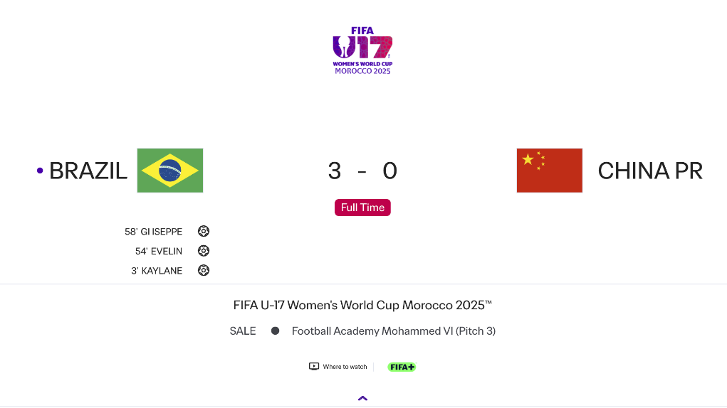 新華社拉巴特10月28日電 在28日進(jìn)行的2025年U17摩洛哥女足世界杯八分之一決賽中,中國隊(duì)以0:3負(fù)于巴西隊(duì),無緣八強(qiáng)。