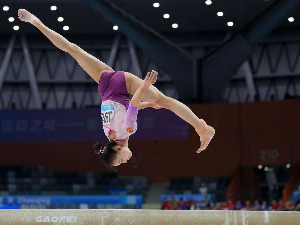 11月13日,廣東隊(duì)選手鐘圻在平衡木比賽中。新華社記者 胥冰潔 攝