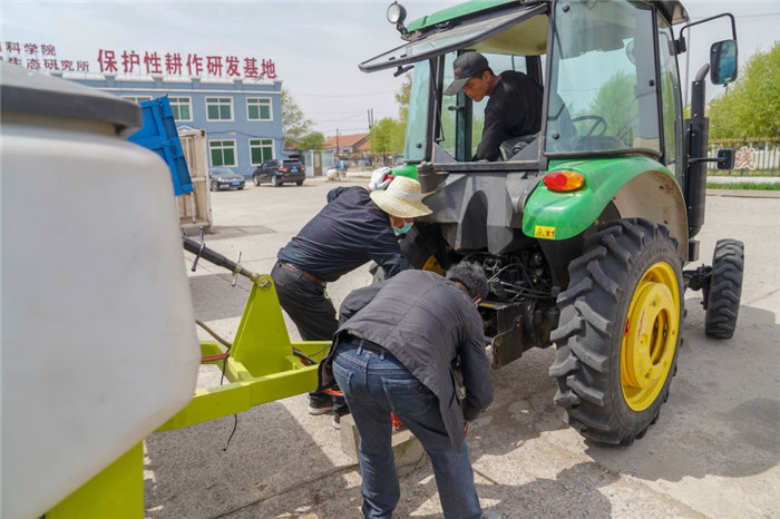△在吉林省四平市梨樹縣康達農(nóng)機農(nóng)民專業(yè)合作社,農(nóng)民在調(diào)試免耕播種機。