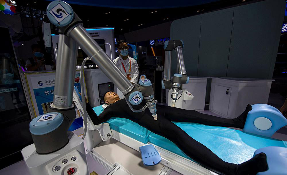△2020年服貿(mào)會(huì)綜合展區(qū),參觀(guān)者正在體驗(yàn)中醫(yī)智能經(jīng)絡(luò)導(dǎo)引機(jī)器人。