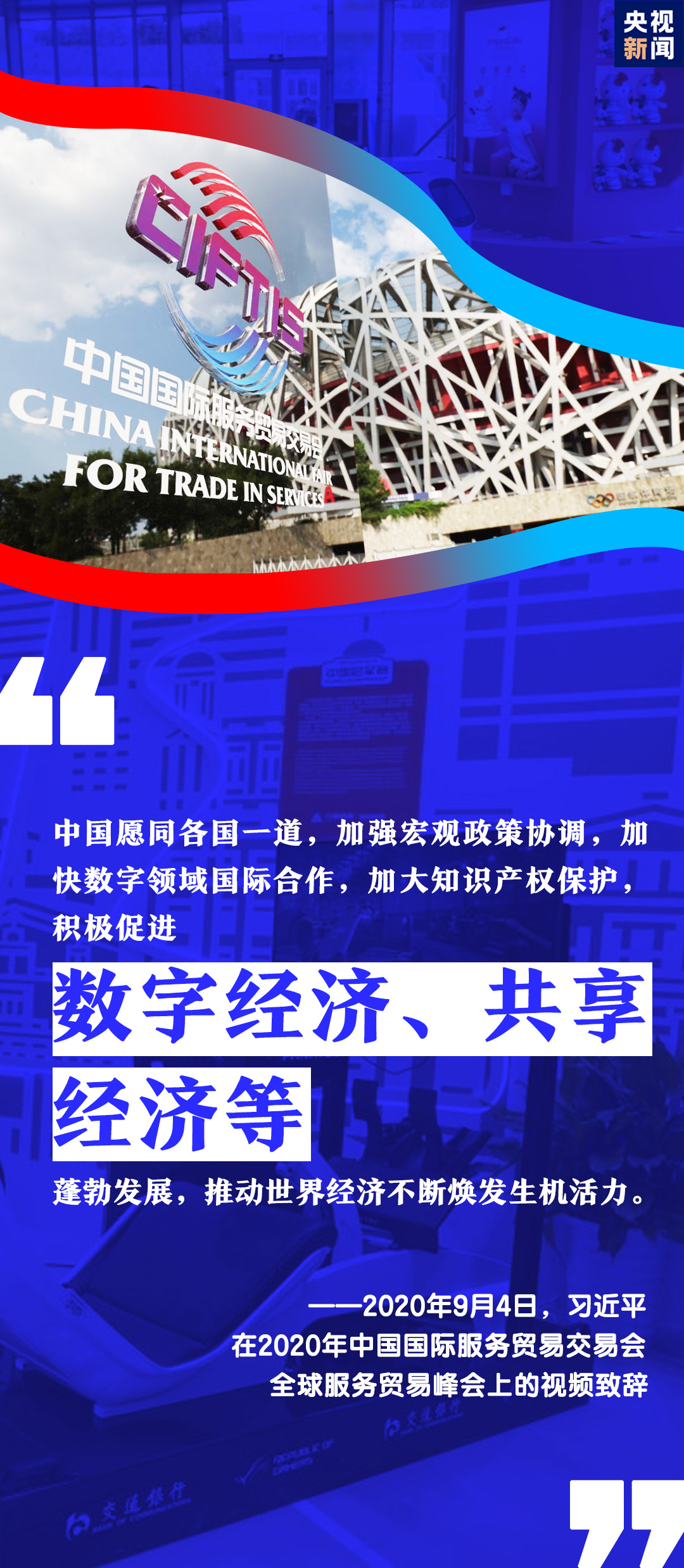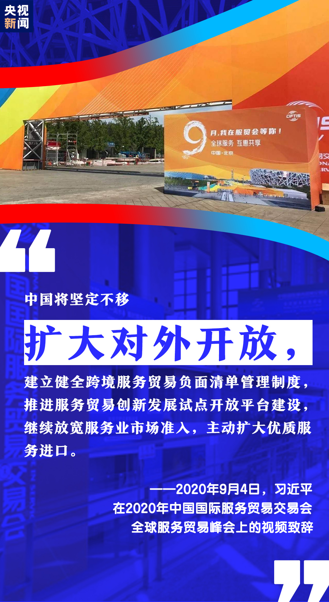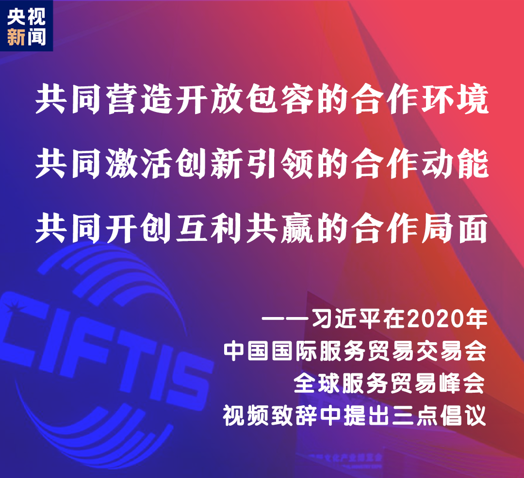 習(xí)近平表示,中國(guó)舉辦2020年中國(guó)國(guó)際服務(wù)貿(mào)易交易會(huì),就是搭建起平臺(tái)和橋梁,讓各國(guó)人民充分展示服務(wù)貿(mào)易領(lǐng)域新發(fā)展新突破,共同享受人類(lèi)社會(huì)發(fā)展進(jìn)步新技術(shù)新成果。