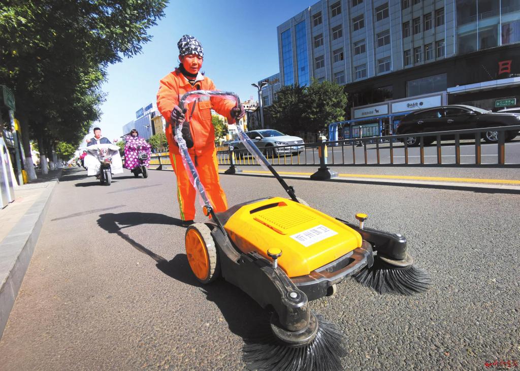10月21日,環(huán)衛(wèi)工人在城區(qū)七一南路用新配置的無塵手推式掃地機進(jìn)行清掃作業(yè)。為鞏固提升創(chuàng)文成果,市環(huán)衛(wèi)處狠抓清掃保潔、嚴(yán)控二次污染,多舉措提升衛(wèi)生質(zhì)量,確保市民有良好的工作和生活環(huán)境。 (張存良 攝)
