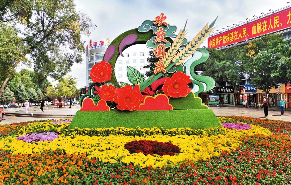“十一”臨近,“歡度國(guó)慶”主題花壇亮相忻州城區(qū)日月廣場(chǎng)。(宮清華 攝)