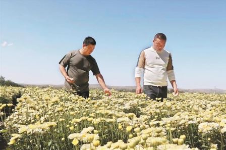 有了方向,行動(dòng)是關(guān)鍵。黨員徐大衛(wèi)主動(dòng)請(qǐng)纓,第一時(shí)間不遠(yuǎn)千里趕赴菊花主產(chǎn)區(qū)射陽考察菊花種植項(xiàng)目,經(jīng)過充分分析研判,篩選適宜五寨種植的品種,最終選定北京菊試種。同時(shí),他帶著誠意誠心,從射陽請(qǐng)來3名技術(shù)專家。在晉西北中藥材產(chǎn)業(yè)孵化園附近,他與3位專家同吃同住,深入田間地頭,與群眾同勞作、共生活。依據(jù)菊花種植要求,手把手教會(huì)群眾平整土地、開挖溝槽、栽種澆水、鋤草施肥和采挖收儲(chǔ)等中藥材精耕細(xì)作技術(shù)。針對(duì)菊花農(nóng)殘、重金屬超標(biāo)的問題,在試種過程中,他精心研究、反復(fù)摸索,大膽探索出了一套適用于菊花的種植技術(shù),實(shí)現(xiàn)了菊花農(nóng)殘可控的突破,先試種的100畝菊花,獲得了成功。