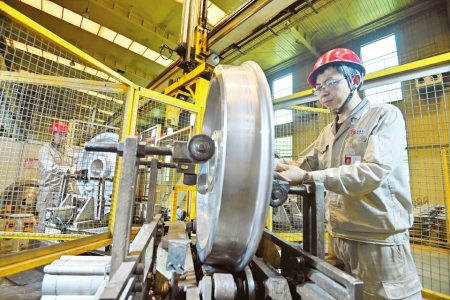俯瞰窗外,流水線上一片片锃光瓦亮的車輪正快速產(chǎn)出,等待裝車發(fā)貨??刂剖依铮瑓⒂^者依然興趣盎然,仔細(xì)傾聽著、品味著“太重制造”自主創(chuàng)新的故事……