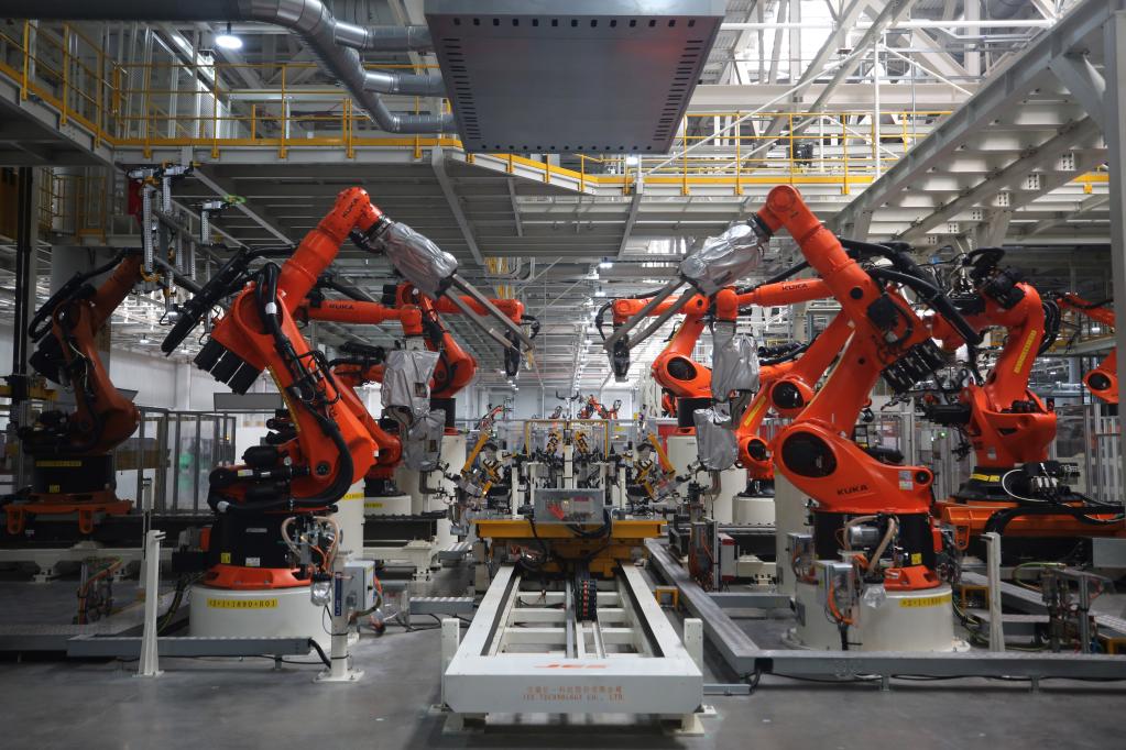 黃色的機(jī)械臂上下?lián)]舞,無人搬運(yùn)車穿梭不停,焊裝線火花四濺,配備了高精度傳感器和先進(jìn)機(jī)器視覺系統(tǒng)的焊接機(jī)器人正在精準(zhǔn)焊接車身部件……