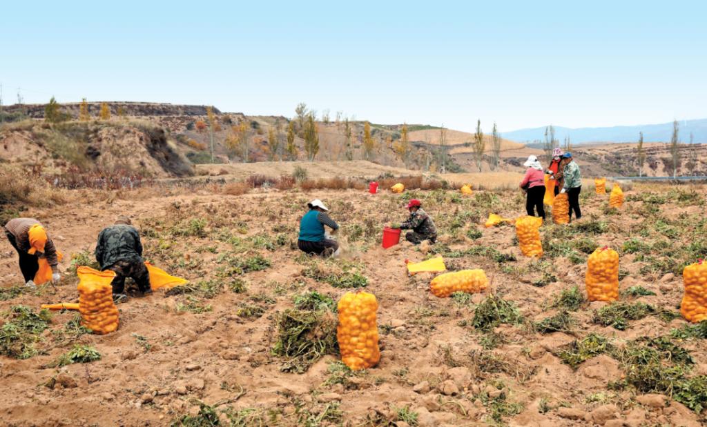 金秋時(shí)節(jié),伴隨著收割機(jī)器的轟鳴聲,一個(gè)個(gè)色澤鮮亮的馬鈴薯從泥土中翻滾而出,擺滿了田間地壟,人們拾撿、裝袋、搬運(yùn),現(xiàn)場(chǎng)一派繁忙的豐收景象。這段時(shí)間,趙家溝村土豆種植大戶苗新亮格外忙碌,他種植的120畝馬鈴薯進(jìn)入了收獲期。苗新亮告訴記者:“我從二十幾戶村民手中一共流轉(zhuǎn)了500畝土地,其中種植土豆120畝,現(xiàn)在正是豐收的季節(jié),每畝產(chǎn)3500斤,一共收了24.5萬斤,按現(xiàn)在的行情,每斤土豆8毛錢,能賣近20萬元。”