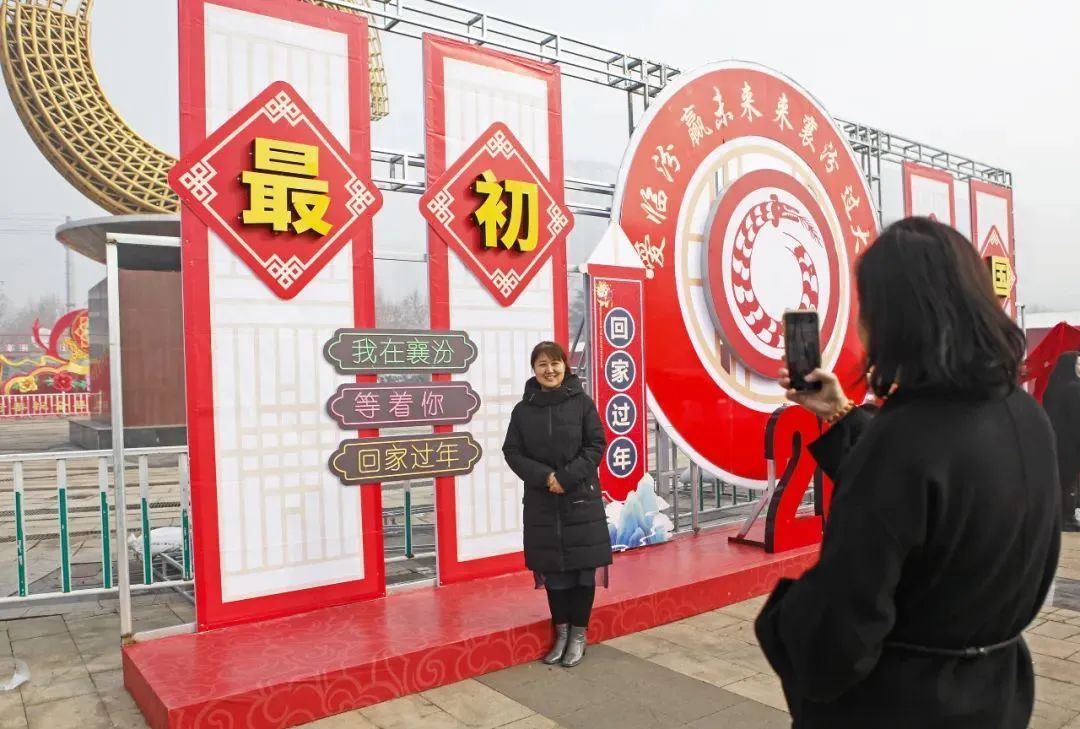 人們在臨汾市襄汾縣丁陶文化廣場內(nèi)陶寺龍盤展板前拍照,歡度新春佳節(jié)