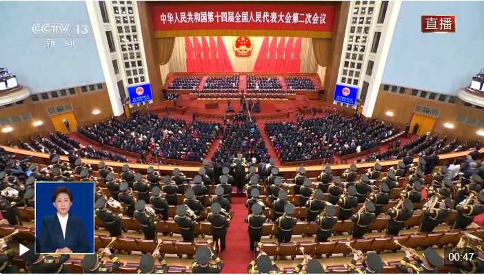 3月5日上午9時(shí),十四屆全國(guó)人大二次會(huì)議在人民大會(huì)堂開幕,全體起立,高唱中華人民共和國(guó)國(guó)歌。