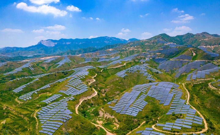 2023年7月18日,在山西省運城市稷山縣100MW光儲一體化項目基地,一排排整齊的光伏板與遠處的青山交相輝映。近年來,稷山縣因地制宜流轉(zhuǎn)荒山荒坡發(fā)展光伏產(chǎn)業(yè),增加農(nóng)民收入,助力鄉(xiāng)村振興。(山西省委辦公廳 供圖)