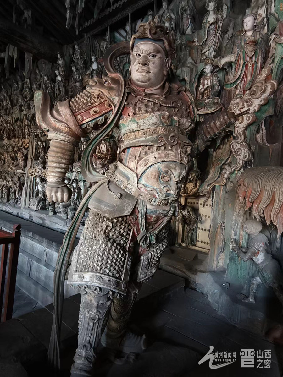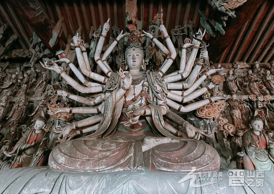 寺內(nèi)擁有總計2000多尊彩塑,大者丈余、小者尺許,每一壁龕為一獨立神話或佛教故事,人物造型生動,神態(tài)逼真,尤其以“千手觀音像”與“韋馱像”最為經(jīng)典。舞蹈《千手觀音》的靈感原型就是這尊千手觀音像。塑像高達數(shù)米,全身貼金,背后伸出上千只手臂,每只手掌上都有一只眼睛,錯落有致,整個造像氣勢恢宏,達到雕塑藝術(shù)中和諧、完美的境界。韋馱像巍然肅立,身披甲胄,神情凝重,整個身體呈現(xiàn)出一種微妙的動態(tài)平衡,是明代彩塑中少見的藝術(shù)杰作,被譽為“天下第一韋馱”“全國韋馱之冠”。景區(qū)講解員侯麗娟介紹:“這尊塑像的高明之處就在于匠師不落俗套,打破了一般程式的限制,賦予了韋馱一種時間的節(jié)奏性和動作的連續(xù)性,產(chǎn)生了雕塑作品的最高境界‘不動之動’。”